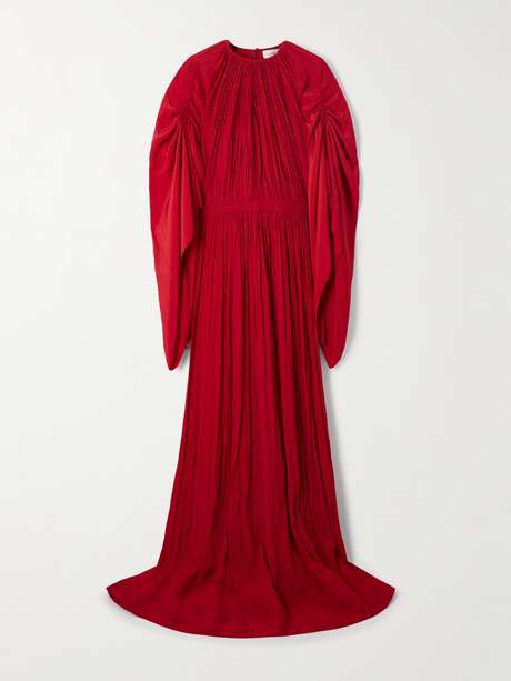 Cette robe du soir Lanvin est réalisée en mousseline vaporeuse qui tombera avec fluidité le long de votre silhouette. Elle est agrémentée de fronces pour plus de mouvement et possède des manches volumineuses, une taille marquée et une jupe qui caressera élégamment le sol.