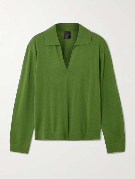 Ce pull façon polo de LESET est tricoté à partir de laine mérinos et s’habille de la nuance verte intemporelle de la marque, baptisée Peridot. Il présente un col en pointe dépourvu de boutonnage et adopte une coupe ajustée mise en valeur par des bordures côtelées. Accompagnez-le d’un jean ou d’une pièce de tailleur aux lignes nettes.