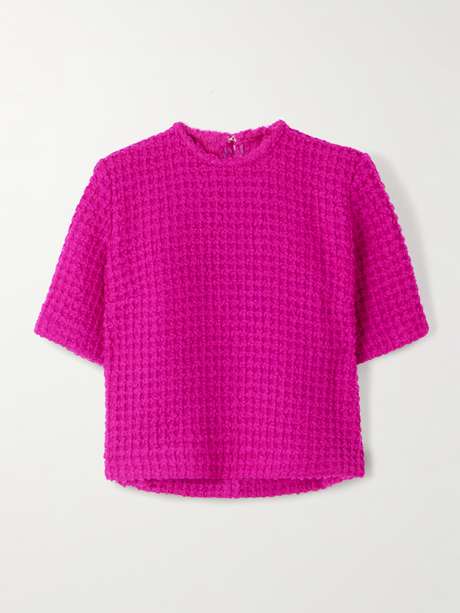 Ce T-shirt signé LIBEROWE est réalisé en bouclé de laine texturé à la teinte fuchsia saisissante. Il présente une encolure ras-du-cou classique et adopte une coupe légèrement ample.
