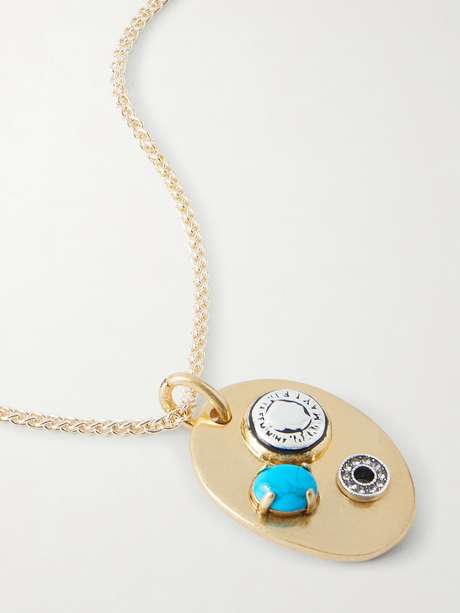 La marque MAISON MAYLE est renommée pour ses bijoux d’inspiration vintage. Ce collier en laiton plaqué or retient un pendentif ovale incrusté d’un cabochon en turquoise, d’un disque en étain gravé et d’un anneau serti de cristaux pavés.