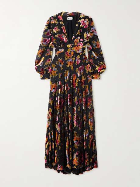 Les collections de RIXO sont inspirées de papiers peints et de tissus d’ameublement vintage. Cette robe est réalisée en velours dévoré à imprimé fleuri, dotée de manches bouffantes vaporeuses et présente un décolleté plongeant. Accompagnez-la d’une paire de mules et d’un petit sac.