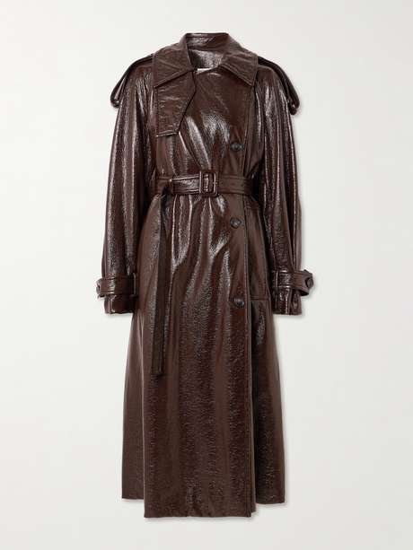 Le trench-coat Bairo de Sportmax a donné le ton du défilé automne-hiver 2025 de la marque. Il est confectionné en coton enduit, une matière qui brille joliment à la lumière. Ses proportions oversize sont un élément récurrent de la collection, et plus généralement de la saison.