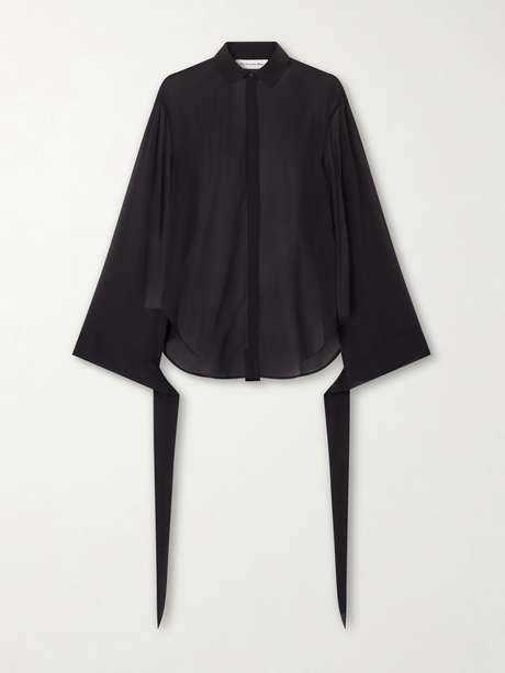 Ce chemisier The Frankie Shop est réalisé à partir d'une mousseline transparente de bonne tenue. Ses manches évasées sont agrémentées de liens à nouer aux poignets, une touche artistique qui attirera tous les regards. Pour les mettre encore plus en valeur, misez sur un bracelet jonc imposant.