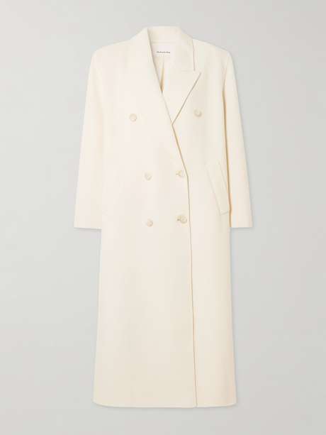 Le manteau à double boutonnage Gaia de The Frankie Shop reprend les codes de la mode homme. Ce modèle en laine mélangée adopte une coupe ample, possède des revers en pointe et se décline dans une teinte ivoire immaculée. Sa doublure partielle vous permettra de l’enfiler aisément sur une robe-nuisette comme sur un pull épais.