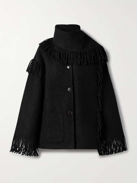 Cette veste signée TOTEME se distingue par ses empiècements façon écharpe qui se draperont élégamment autour de votre cou. Elle est confectionnée en laine mélangée, ornée de longues franges et se ferme à l’aide de boutons effet écaille qui viennent apporter un soupçon de contraste.