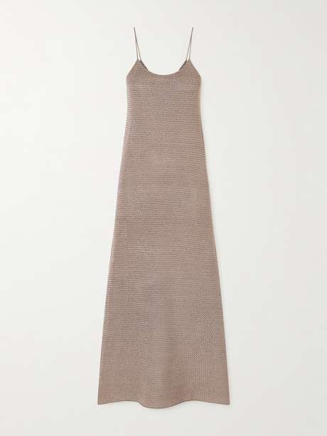Cette robe longue de Veronica de Piante évoque une romance discrète grâce à sa texture riche et sa silhouette fluide. Elle est réalisée en soie crochetée, épouse les formes du corps et possède de fines bretelles qui accentuent son élégance sobre. Sa douce teinte beige se marie à merveille avec des accessoires neutres.