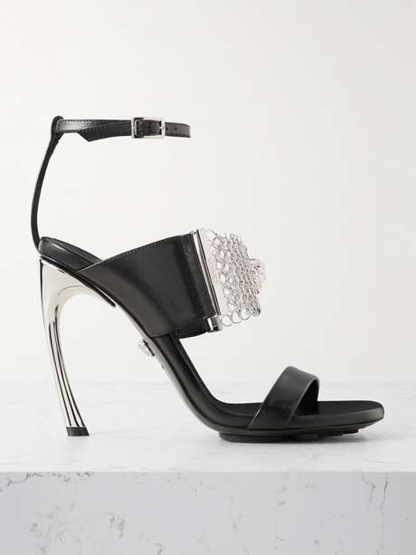Ces sandales ont accompagné de multiples looks à l’occasion du défilé automne-hiver 2025 de Versace, prouvant ainsi à quel point elles sont faciles à associer. Cette paire est fabriquée en Italie à partir de cuir lisse et présente une bride en PVC transparent surmontée de cotte de mailles argentée, un détail assorti à l’ornement Medusa signature de la maison et à son talon aiguille sculptural.