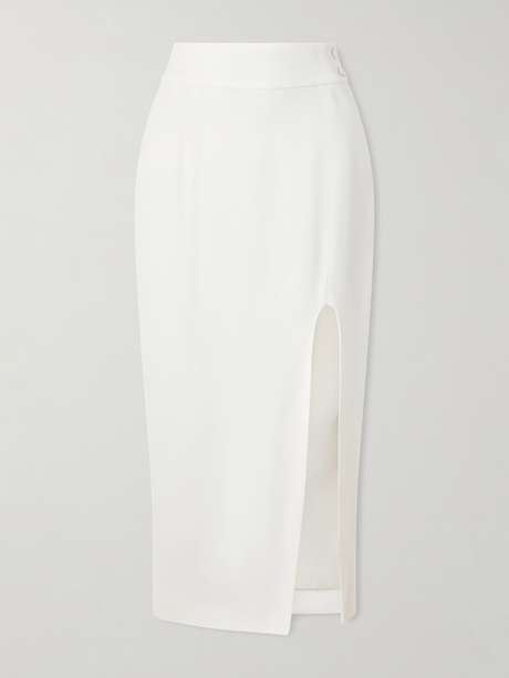 Cette jupe midi signée Victoria Beckham illustre l’esthétique féminine et sophistiquée de la créatrice. Elle est confectionnée en serge, fendue jusqu’à la cuisse sur l’un de ses côtés et conçue pour se porter haut sur la taille.