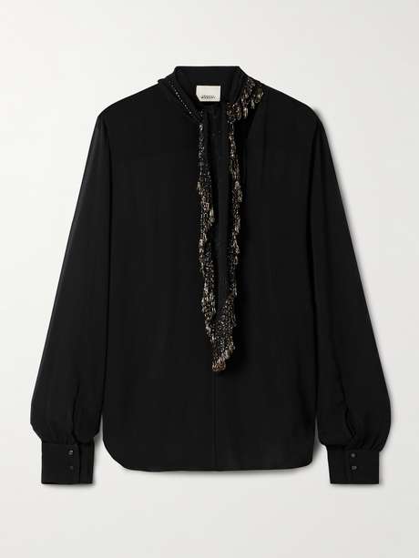 La blouse Elaura d’Isabel Marant est parée de liens aériens au niveau du cou qui sont ornés de perles, ce qui apporte de la sophistication à sa silhouette simple. Elle est réalisée en mousseline de soie légère et pourvue d’un ourlet incurvé que vous pourrez aisément glisser dans un jean ou une jupe.