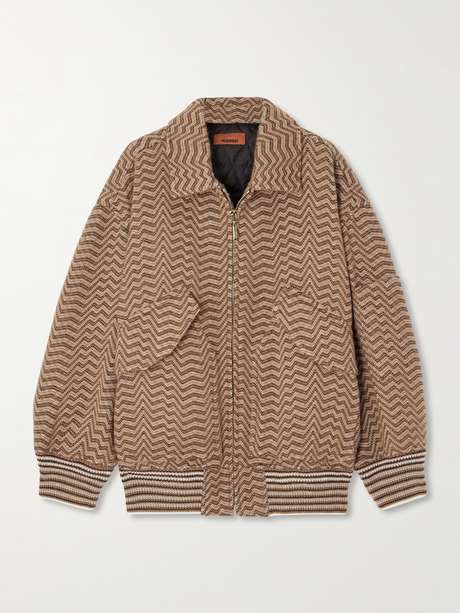Le défilé automne-hiver 2025 de Missoni, présenté à Milan, alliait tradition et modernité à travers des silhouettes oversize. Cette veste est réalisée en Italie à partir de laine et de coton mélangés, et revêt les chevrons signature de la griffe. Ses bordures en mailles côtelées à rayures créent un contraste tendance.