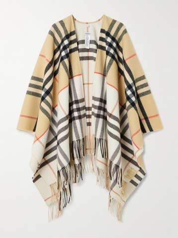 Cape oversize en cachemire et laine mélangés à carreaux et à franges