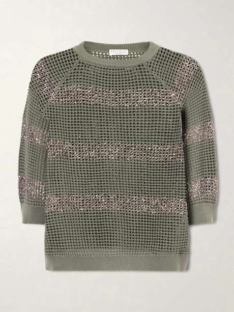 BRUNELLO CUCINELLI Pull en coton à mailles ajourées, rayures et sequins
