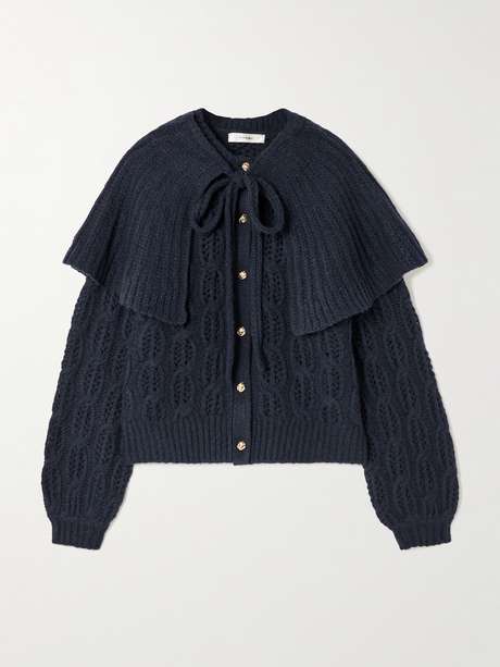 Ce cardigan FRAME se distingue par la petite cape amovible en mailles côtelées qui repose sur les épaules. Il est réalisé en laine mérinos mélangée, et arbore des finitions torsadées et en pointelle délicates ainsi qu’une rangée de boutons dorés. Unissez ses liens en un joli nœud pour lui apporter une touche romantique.