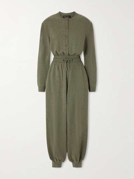 Au premier regard, cette combi-pantalon signée Loro Piana ressemble à un cardigan boutonné qui aurait été soigneusement glissé dans un pantalon de survêtement. Elle est réalisée en Italie à partir de cachemire à jauge fine et pourvue d’un cordon de serrage qui souligne la taille.