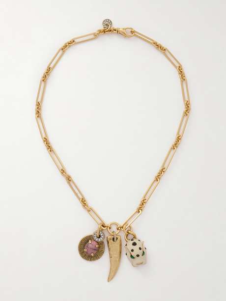 Ce collier MAISON MAYLE est orné de pendentifs uniques qui ajouteront une touche de fantaisie à vos tenues. Il se compose d'une chaîne trombone en métal plaqué or ainsi que de pierres, d'émail et de cristaux qui lui confèrent un effet plus réaliste.