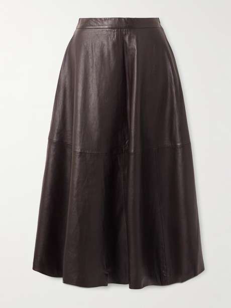 Cette jupe RÓHE est réalisée en cuir tendre à la riche nuance marron et se compose d’empiècements qui mettent en valeur sa coupe évasée classique. Mettez votre taille en valeur en glissant un T-shirt ou un pull souple à l’intérieur.