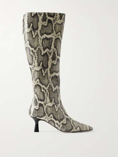 Les chaussures de la marque berlinoise Aeyde sont conçues pour être portées et choyées pendant de nombreuses années. Ces bottes sont fabriquées à partir du cuir effet serpent de la marque et reposent sur des talons évasés de 65 mm, ce qui les rend particulièrement confortables.