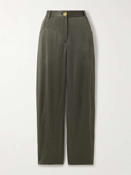 Ce pantalon fuselé de BLAZÉ Milano est confectionné en crêpe de Chine kaki au tombé fluide. Il est doté d’une taille haute et agrémenté des poches Smiley signature de la marque sur les hanches. Associez-lui la veste assortie, disponible dans notre sélection.