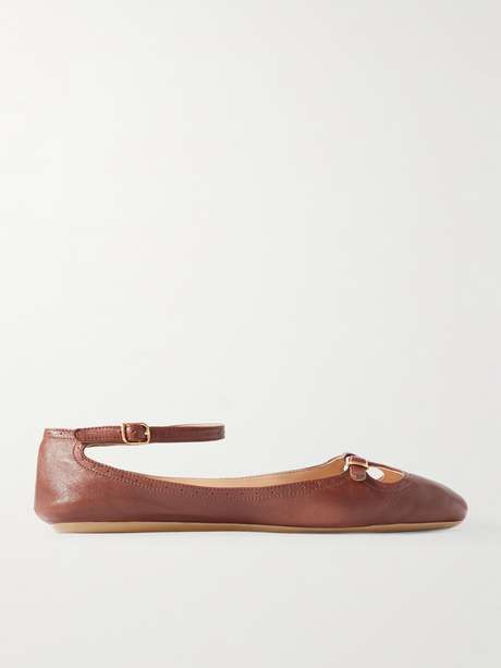 Ces ballerines signées Chloé, dévoilées lors du défilé hiver 2025 de la maison, sont issues d’une collection inspirée de souvenirs d’époques révolues. Elles sont réalisées en cuir doux, présentent un bout notamment agrémenté de découpes, et s’ajustent à l’aide de brides à boucles situées à la cheville et au niveau de leur décolleté. Accompagnez-les d’un jean évasé et d’un caraco volanté.