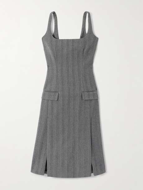 Cette robe a été présentée lors du défilé automne-hiver 2025 de Ferragamo, une collection qui regorge de pièces de tailleur classiques. Elle est réalisée en Italie à partir de laine mélangée à chevrons, s’habille de rayures et s’achève sur un ourlet rehaussé de deux petites fentes sur le devant. Accompagnez-la de la veste coordonnée et d’une paire d’escarpins noirs traditionnels.