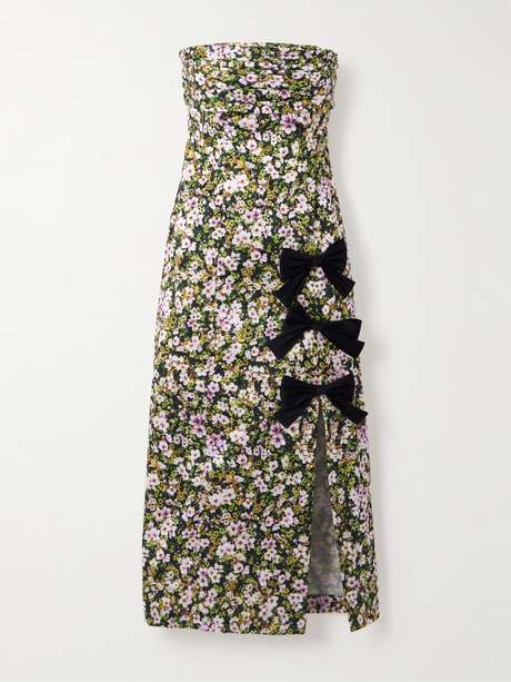 La robe Rosetta de Kika Vargas est confectionnée en taffetas lisse imprimé de fleurs joliment détaillées. Elle présente un corsage bustier légèrement froncé, ayant pour effet de valoriser sa coupe ajustée, et possède une jupe droite généreusement fendue. Assortissez vos accessoires à ses trois ravissants nœuds.