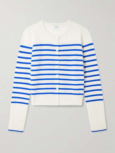 Ce cardigan La Ligne se distingue par ses rayures bleues et crème. Il est tricoté à partir de cachemire, pourvu d’une encolure ras-du-cou classique et bordé de finitions côtelées qui le rendent encore plus douillet.