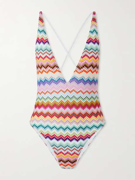 Ce maillot de bain Missoni Mare se fondra parfaitement dans les eaux turquoise tropicales et les décors luxuriants. Il présente les iconiques mailles crochetées à chevrons de la marque et se voit parsemé de fils métallisés scintillants. Son décolleté plongeant et son bas échancré vous mettront élégamment en valeur.