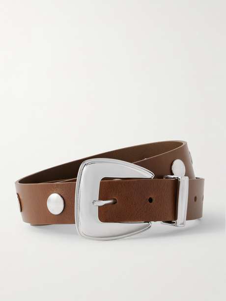 Quelques accessoires triés sur le volet sont indispensables à toute garde-robe bien pensée. La ceinture Perth de The Frankie Shop est réalisée en Italie à partir de cuir vieilli et ornée de clous argentés, assortis à sa boucle de fermeture à l’esprit western.