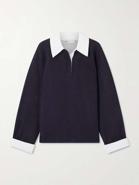 Tory Burch décrit sa collection automne-hiver 2025 comme une version revisitée des vêtements de sport américains. Inspiré des maillots de rugby, ce polo en laine et en coton mélangés présente des bordures contrastantes et adopte une coupe décontractée. Inspirez-vous du défilé de la griffe en l'associant au pantalon assorti.