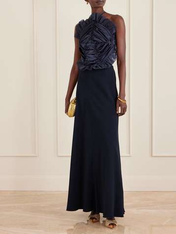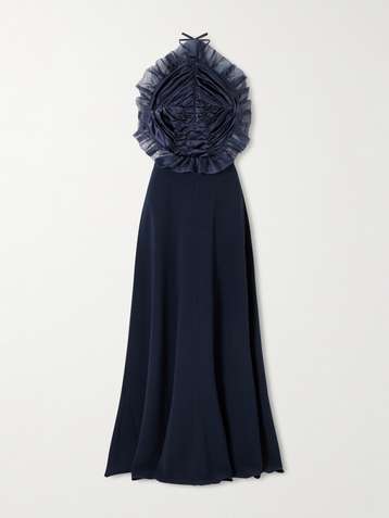 Abito a schiena scoperta in raso di seta con scollo all'americana e finiture in organza e ruches