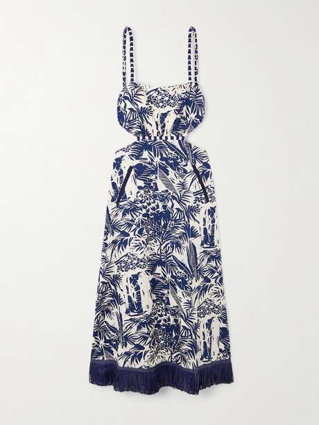 JOHANNA ORTIZ Abito midi in popeline di cotone stampato con perline e frange Harmony